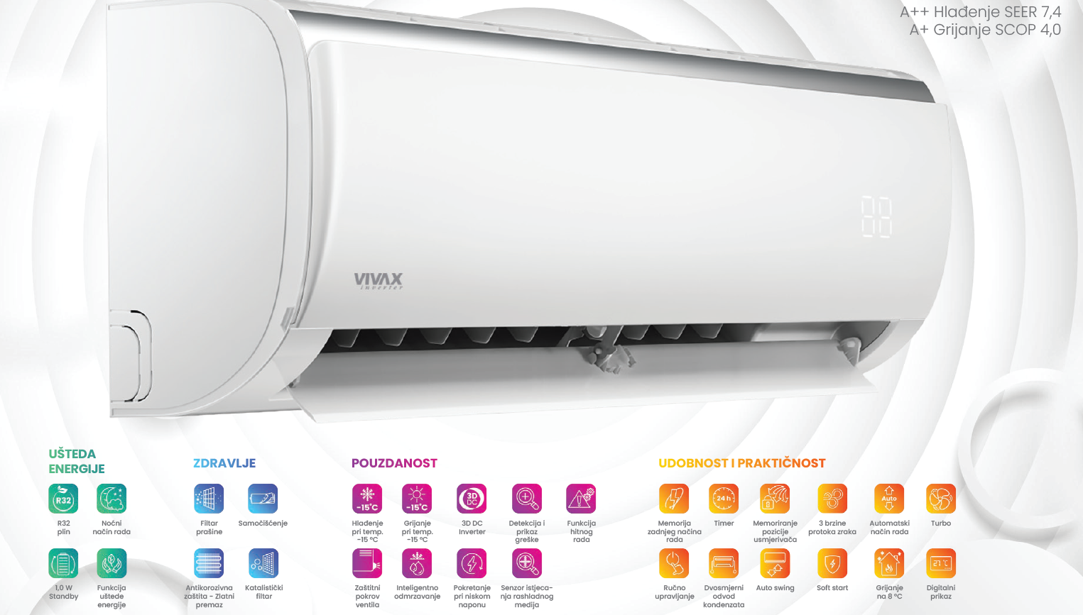 | Funkcionalnosti | 1W stand by; Noćni način rada; Funkcija uštede energije; Katalistički filtar; Filtar prašine; Samočišćenje; Zlatni premaz; Zaštitni pokrov ventila; Inteligentno odmrzavanje; Detekcija i prikaz greške; Senzor istjecanja rashladnog medija; Pokretanje pri niskom naponu; Hlađenje i grijanje pri temperaturi -15°C; ‘I feel funkcija’; Ručno upravljanje; Mono i multi kompatibilnost; 3 brzine protoka zraka; Dvosmjerni odvod kondenzata; Auto swing; Memoriranje pozicije usmjerivača; Automatski način rada; Memorija zadnjeg načina rada; Timer; Turbo mode; Soft start; Digitalni prikaz |